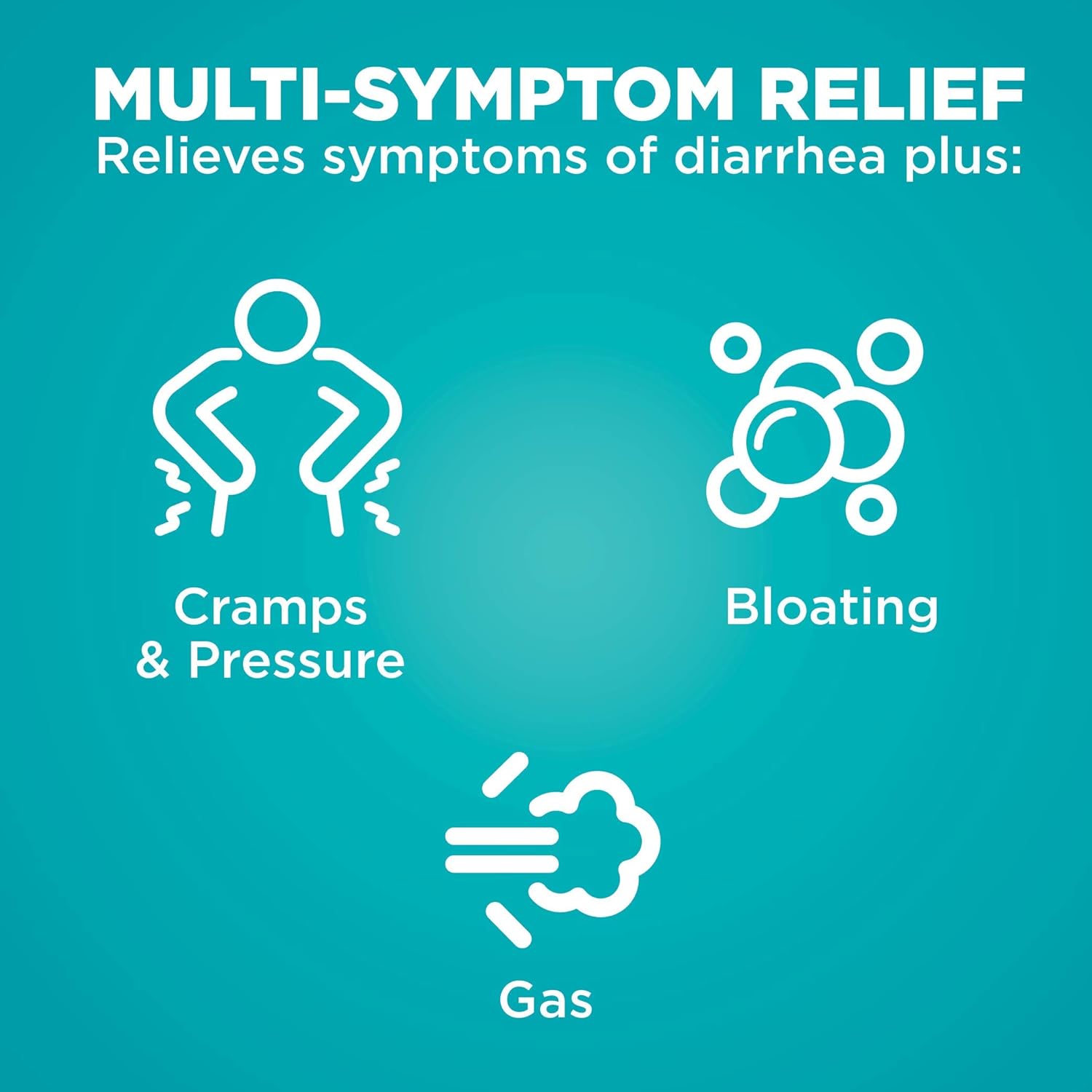 $10 ACTIVE INGREDIENTS: This product contains loperamide hydrochloride 2 mg, anti-diarrheal, and simethicone 125 mg, anti-gas, which compares to the active ingredients of Imodium Multi-Symptom Relief. MULTI-SYMPTOM RELIEF: This anti-diarrheal and anti-gas medicine relieves symptoms of diarrhea plus bloating, pressure and cramps, commonly referred to as gas. WHAT IS DIARRHEA: Diarrhea is a loose and watery bowel movement and very common as many people may have it once or twice a year. Usually not serious, it will typically last two or three days and is normally treated with an over-the-counter medication. DIARRHEA FACT: Properly washing hands can help eliminate the spread of infection that causes a serious type of diarrhea. HELP PREVENT DEHYDRATION: Drink plenty of clear fluids to help prevent dehydration caused by diarrhea.